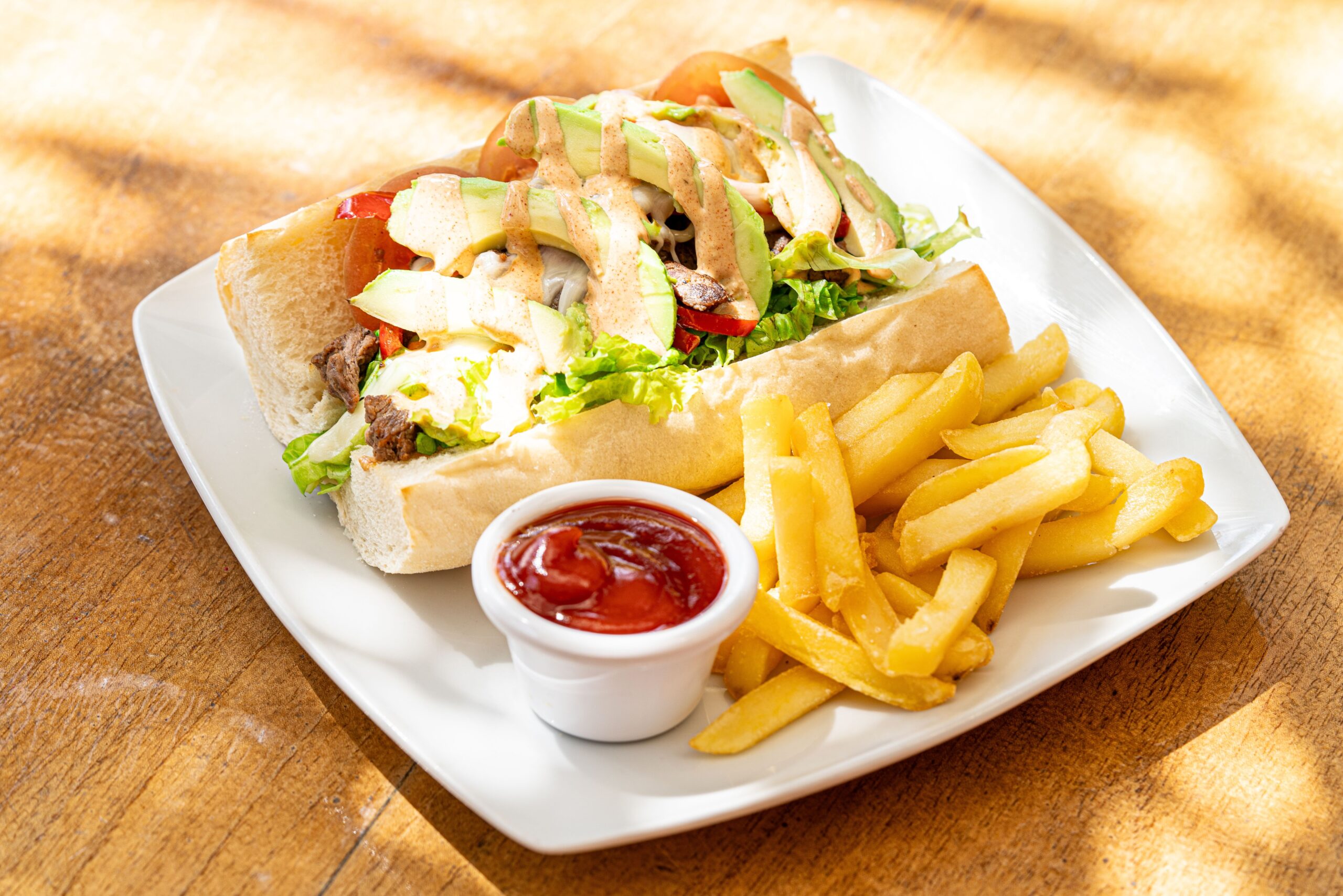Deliciosas fajitas de carne, salteadas con chile morrón, cebolla y queso mozarella, sobre una cama de lechuga fresca y tomate, en un baguette recién horneado.